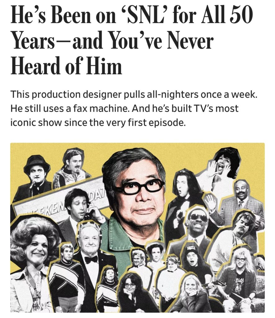 I just read Ben Cohen’s profile of Leo Yoshimura in his Science of Success column in this weekend’s The Wall Street Journal. Yoshimura, the legendary production designer at SNL – “the craziest deadline in television,” – has been with the show for 50 years.